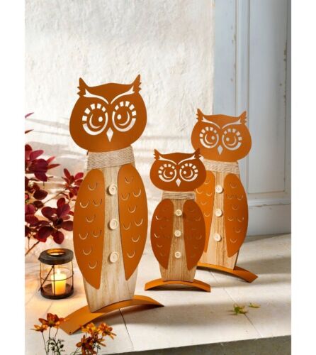 Eulen-Trio ist im Materialmix aus Holz und Metall in Rostoptik